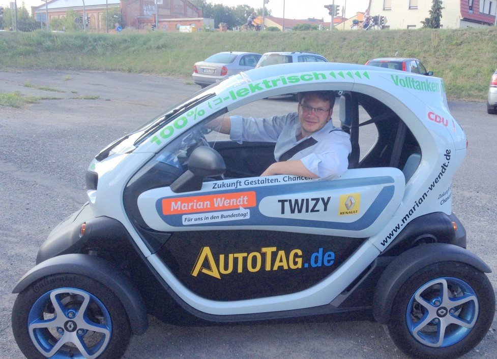 Torgau - Der CDU-Bundestagskandidat Marian Wendt wird zu den öffentlichen Terminen und Infoständen in dieser Woche mit einem Elektroauto, einem Renault Twizy, fahren. Vor Ort besteht hierbei auch für interessierte Bürgerinnen und Bürger die Möglichkeit, einmal die innovativen Gefährt Platz zu nehmen und eine Runde fast geräuschloses und umweltschonendes Fahren zu erleben.